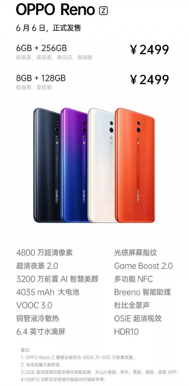 售價方面,Reno Z 的 6+256GB 和 8+128GB 兩個版本均售價 2499 元,其中 8+128GB 版只有極夜黑和星辰紫兩種配色可選,將于 6 月 6 日開售。