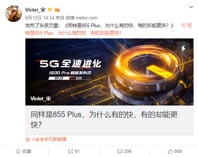 8月20日訊,iQOO Pro 5G手機(jī)的安兔兔跑分成績曝光了,其擁有接近50萬的跑分成績。在所有搭載驍龍855 Plus移動平臺的手機(jī)中,iQOO Pro 5G的跑分成績算是最高的。其實(shí)在不久前,iQOO的產(chǎn)品經(jīng)理@Violet_宋 在微博發(fā)表一篇文章,詳細(xì)解讀了iQOO Pro 5G版雖然同樣采用驍龍855 Plus移動平臺,但卻能夠更快的原因。