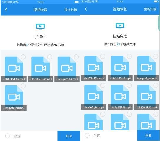 選擇之后,系統(tǒng)會(huì)進(jìn)入自動(dòng)掃描的頁面,等待片刻之后就可以看到被刪除的視頻、音頻信息了,選擇需要恢復(fù)的,確認(rèn)恢復(fù)就可以啦。