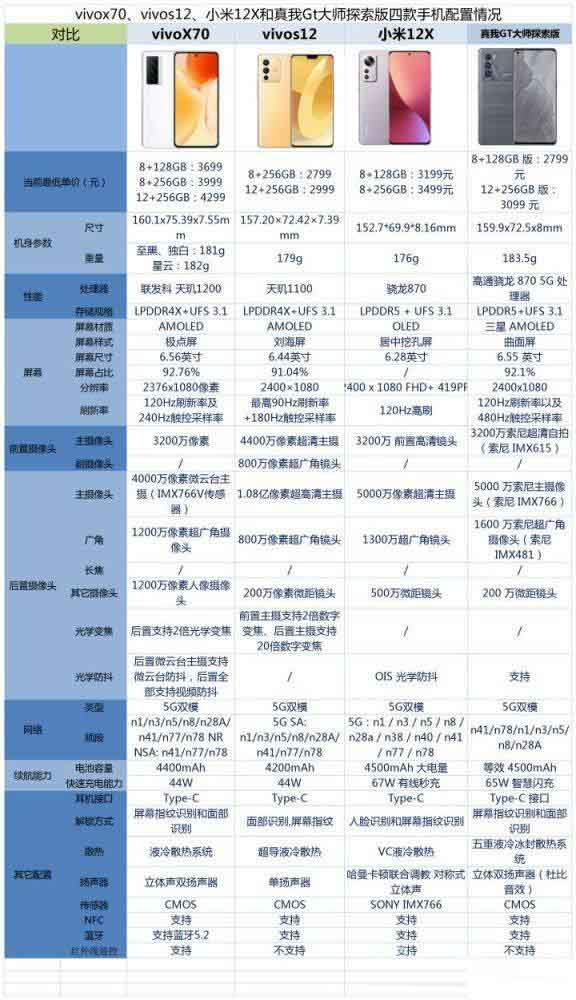 Vivo S12/Vivo x70/真我GT大師探索版和小米12x四款手機對比評測