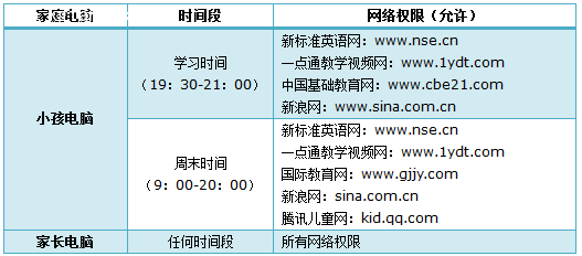 某家長希望小孩在學習時間和周末只能訪問學習網站,但自己的電腦并不受控制。家長需求如下: