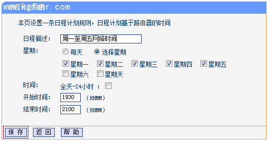 添加周一至周五允許上網的時間(即19:30-21:00)后,點擊 保存。