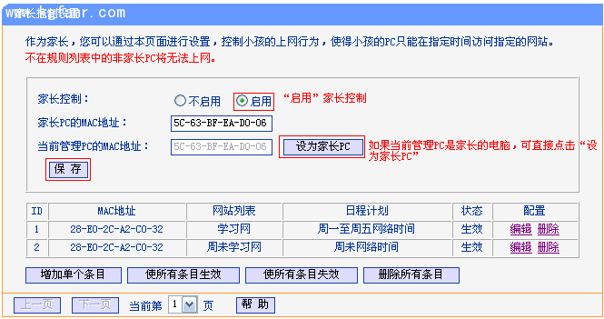 選擇 啟用 家長控制,如果當前管理電腦為家長的電腦,點擊 設為家長PC,如果不是,請手動填寫家長電腦的MAC地址,點擊 保存。