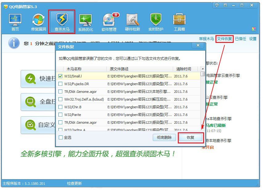答:QQ電腦管家從4.5版本開始,引進國際領先的本地查殺引擎,大大提高木馬查殺能力。您在安裝完QQ電腦管家后,即默認開啟了雙引擎模式,同時病毒庫的也將自動升級,讓您輕輕松松就能體驗強大的木馬雙引擎查殺能力。
