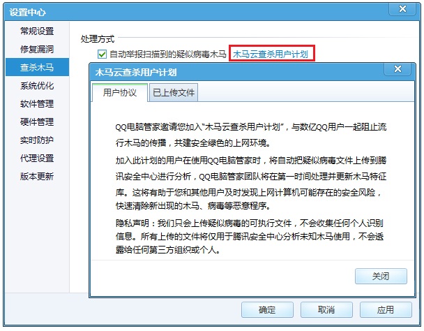 QQ電腦管家被安裝后,默認用戶不參加此計劃,在明確告知用戶計劃內容后,用戶可以自主選擇是否參加。對于拒絕參加計劃的用戶,QQ電腦管家不會自動上傳此類未知文件。