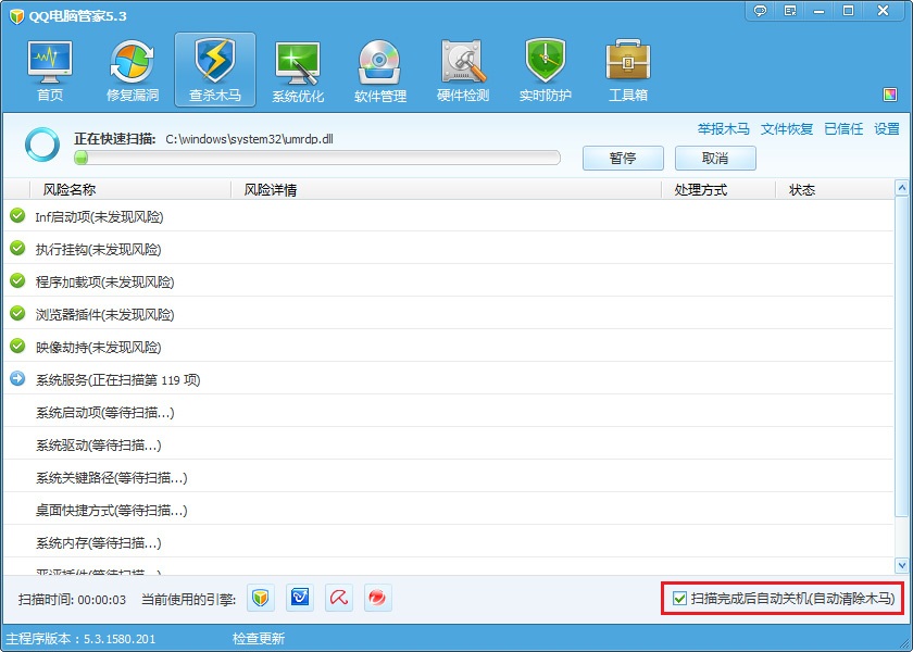 當木馬掃描完成后,會彈出自動關機的提示框,此時QQ電腦管家已經自動清除了發現的風險,您可以選擇立即關機,或取消自動關機。