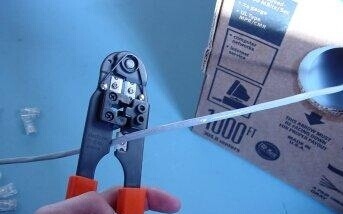 4、確認(rèn)所有芯線都插到水晶頭底部后,即可將插入網(wǎng)線的水晶頭直接放入網(wǎng)線 鉗壓線缺口中。水晶頭放好后即可壓下網(wǎng)線鉗手柄,一定要使勁,使水晶頭的插 針都能插入到網(wǎng)線芯線之中,與之接觸良好。