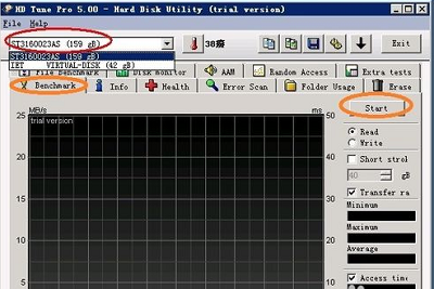 2、然后打開 HD Tune 軟件以后,在“Benchmark”頁面下,點擊左上角的下拉列表選擇要進行性能測試的硬盤,軟件默認為“讀read”測試,然后點擊右邊的“Start”,如圖所示: