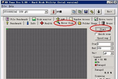 ①選擇“Error Scan”,點擊左上角的下拉列表選擇要掃描錯誤的硬盤,然后點擊右邊的“Start”,如圖所示