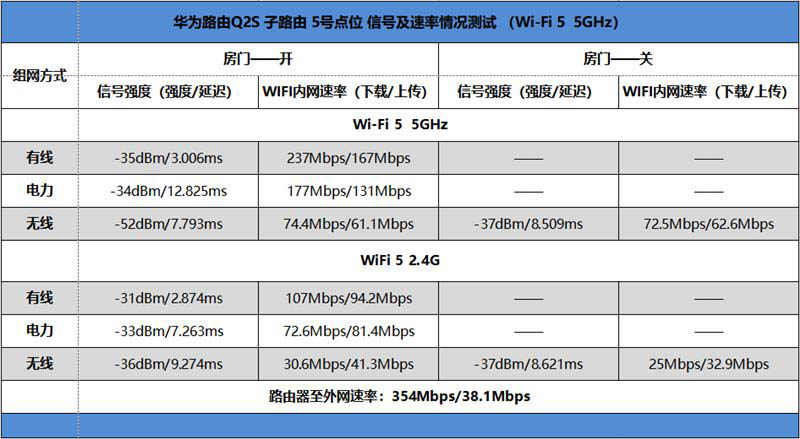 分別使用網線、電力線、無線的方式將華為路由Q2S的子路由與主路由組網,其中無線由于信號原因,自動識別采用2.4GHz Wi-Fi組網,且位置放置在門旁,其它組網方式的位置與圖中相同,測試組網成功后的信號強度、速率的表現。