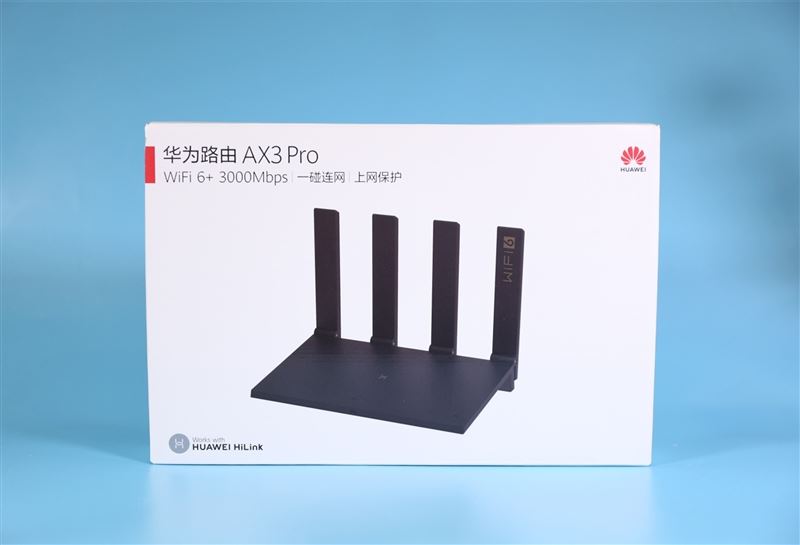 包裝盒,簡潔的設計,標注了華為路由AX3 Pro的幾個特色功能、Wi-Fi 6、3000Mbps、一鍵聯(lián)網(wǎng)和上網(wǎng)保護。