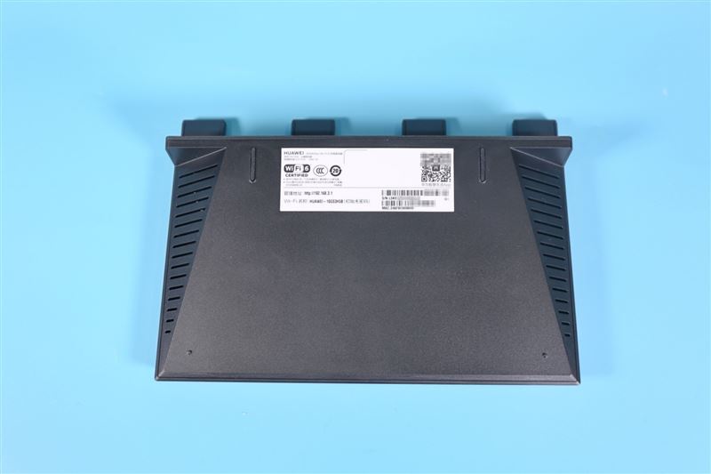 底部,華為路由AX3 Pro采用了側(cè)開孔的方式來保證被動散熱的效果。此外標簽上還注明了Wi-Fi信息,確保新手第一次使用也能順利連接。