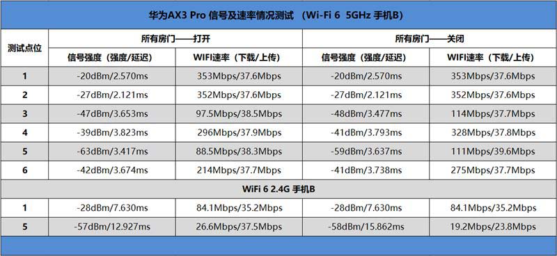 根據結果不難發現,采用凌霄芯片的華為路由AX3 Pro在Wi-Fi 6下對于兩款不同Wi-Fi 6方案的手機都有著不錯的支持,能夠滿足覆蓋整屋的需要。