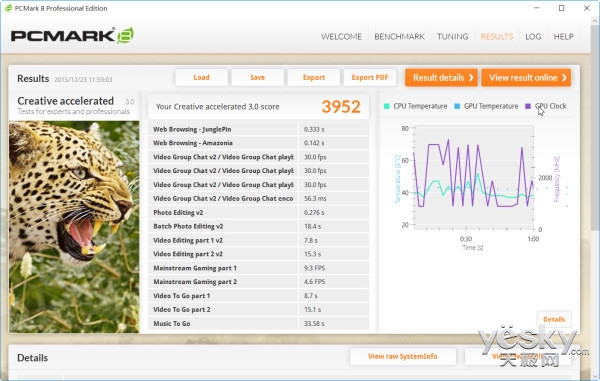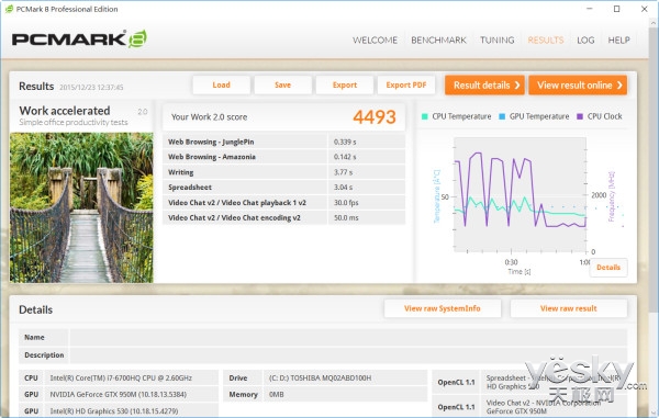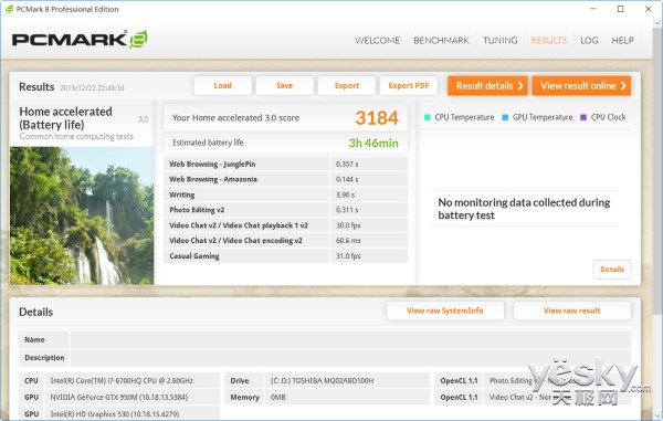隨后我們對這臺Acer V5-591G進行PCMARK8測試,其搭載了英特爾第六代酷睿i7-6700HQ處理器、GTX 950M獨立顯卡、海力士DDR4-2133 8GB內存以及東芝8GB閃存+1TB機械硬盤。