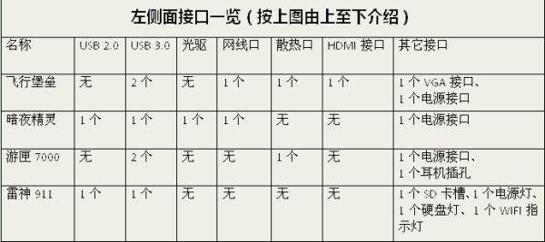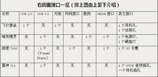 在左側面,四款產品在接口上雖然沒有什么特殊性可說,但是大家通過上圖可以發現它們的造型和厚度卻各不相同。造型方面,飛行堡壘和暗夜精靈類似都采用了斜坡式下收的設計;游匣7000則采用了非常具有時尚感的偏菱形曲面設計;雷神911除了有紋路圖案以外,在造型上并沒有什么特殊的設計。