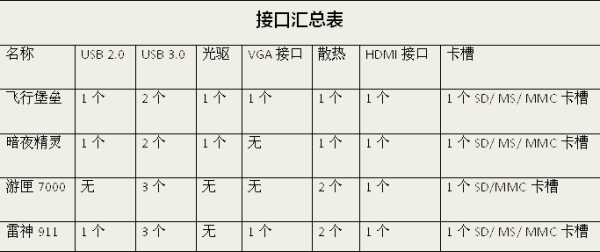 在這四款游戲本中,雷神的USB接口數量是最多的產品;而游匣7000則是唯一擁有配備了PowerShare功能的USB 3.0接口的產品;飛行堡壘和暗夜精靈則因為配備了光驅從而比前兩個產品更加全面。