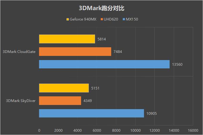 可以看到高性能版的MX150跑分非常強(qiáng)悍,在CloudGate測(cè)試中,跑分超過(guò)英特爾集顯UHD620 81%,是上一代輕薄本獨(dú)顯940MX的130%!而在SkyDriver測(cè)試中,MX150的表現(xiàn)更加強(qiáng)悍,跑分超越一倍不止。