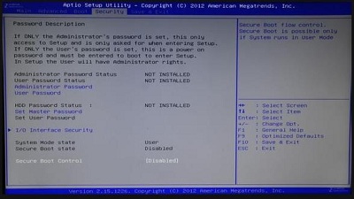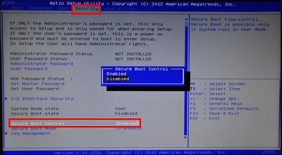 2、然后通過鍵盤上的左右方向鍵切換到“Security”,在該標簽下將光標移至“Secure BOOT Control”,可以注意到當前屬性值為Enabled,回車打開設置窗口,在此選擇“Disabled”,如下圖所示: