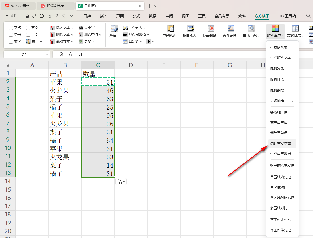 我們在進行wps表格數據錄入的時候,有些時候會在某一列的單元格中輸入一些數據,其中輸入的數據內容可能會出現重復的情況,如果想要知道這一列的數據中出現的重復次數有多少,那么我們該如何設置呢,如果你的表格工具中有安裝一個方方格子的工具,那么我們就可以在方方格子中點擊打開隨機重復功能,將其中的統一重復次數功能啟用進行設置即可,下方是關于如何使用WPS excel實現統計重復次數的具體操作方法,如果你需要的情況下可以看看方法教程,希望小編的方法教程對大家有所幫助。