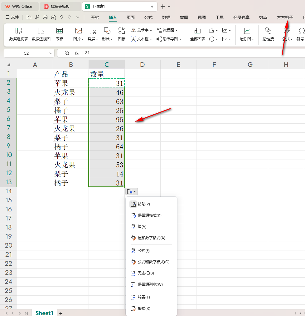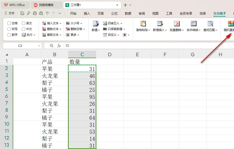 2.這時我們將其中的數量這一列選中,之后點擊頁面菜單欄中的【方方格子】選項卡點擊打開。