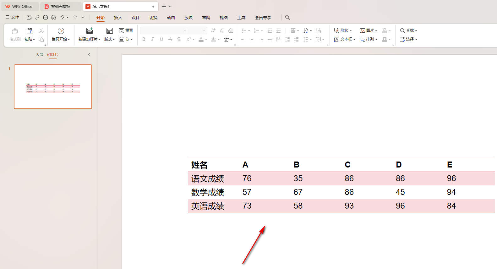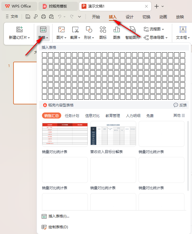 1.將演示文稿新建好之后,點擊【插入】-【表格】,選擇好相應的行數和列數進行插入到頁面上。