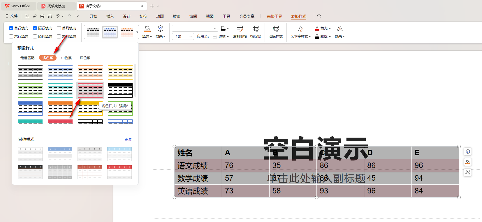 4.在打開的窗口中,我們點擊【淺色系】,然后選擇自己喜歡的一個各行變色的表格樣式插入。