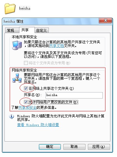 一、首先要保證你在局域網(wǎng)內(nèi)網(wǎng)中聯(lián)網(wǎng)正常,在你的盤符下新建一個文件夾,比如我們在F盤建立一名為“heisha”的文件夾,新建后右鍵→屬性選擇該文件夾,在共享中共享此文件,如圖: