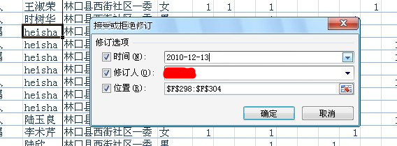 3. 接受或拒絕修訂。什么是接受或拒絕修訂呢?上圖我們看見,某用戶修改了七個heisha,我是這個設(shè)置工作薄共享的人,這個程序在我的機器中,這里的我, 相當(dāng)于主機,而某用戶相當(dāng)于訪問、協(xié)助我的作用,但是某用戶修改的這七個heisha我是否同意修訂(修改)呢?或者說,這七個heisha是誰修訂的 呢?看圖說話: