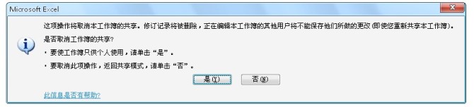 如果上面的你全部掌握的話,取消共享就非常簡單了,審閱→更改→共享工作薄→編輯→將允許多用戶同時編輯的對勾取消,確定后會出現(xiàn)提示,如圖。