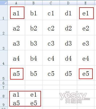 如圖2所示,按Ctrl鍵后同時(shí)選中a1、e1、a5、e5四個(gè)單元格,復(fù)制后粘貼會(huì)發(fā)現(xiàn)復(fù)制的內(nèi)容連接到了一起。這樣可以達(dá)到快速復(fù)制不連接單元格的作用。當(dāng)然如果中間有空白單元格則是無法選中的。