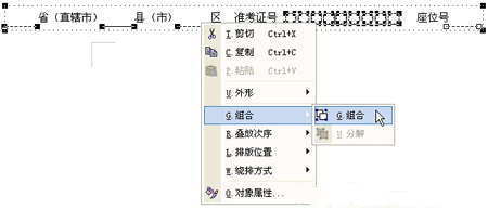 (3)調整完成后,點擊工具欄中的選擇工具按鈕,拖動鼠標選擇輸入的文字、直線以及矩形框。并將鼠標置于選中的對象上方點擊右鍵,在彈出的快捷菜單中選擇“組合”-“組合”,如圖05所示。