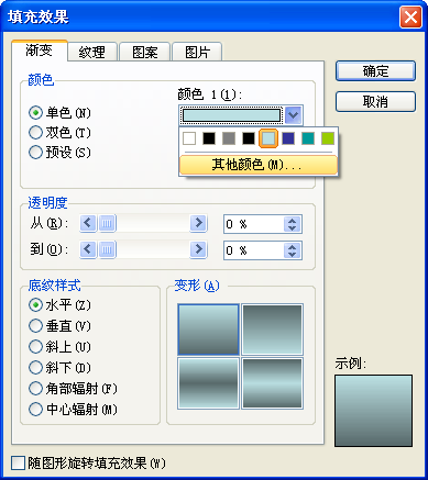 2、在彈出的“填充效果”對話框里,選中“顏色”標簽下的“單色”單選項后,單擊“顏色1”標簽下的色塊,在彈出的下拉列表里單擊“其他顏色…”選項(如圖3),在彈出的“顏色”對話框里單擊“標準”標簽后,再單擊調色盤中的紅色色塊(如圖4),單擊“確定”按鈕返回“填充效果”對話框。