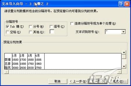 在這一步我們可以選擇不同的分隔符,并能實時預覽分隔效果。因為我們的文本文件是Tab鍵來分列的,所以選擇Tab鍵作為我們的分隔符號。