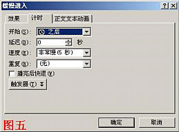 8、在“任務窗格”中雙擊第二張圖片的動畫設置選項,打開“緩慢進入”對話框(如圖五),切換到“計時”標簽下,按“開始”右側的下拉按鈕,在隨后出現的下拉列表中,選擇“之后”選項,并將下面的“延遲”選項設置為“0”。