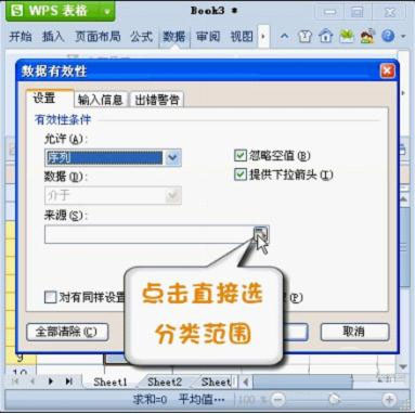接下來我們對數據的有效性條件進行設置,在對話框中選擇“設置”的選項卡,在選項卡中的打開“允許”下方的下拉式菜單,選擇序列。(如圖3)