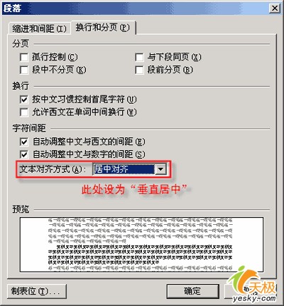 首先選中公式所在段落,從菜單中選擇“格式-段落”,在“換行與分頁”選項(xiàng)卡的“文本對齊方式”選項(xiàng)中選擇“居中對齊”(圖2),按“確定”按鈕退出。