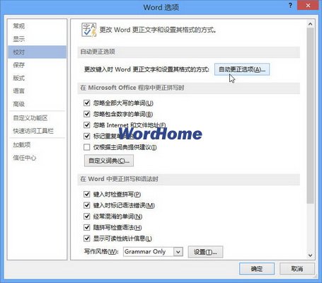 第2步,在打開(kāi)的“Word選項(xiàng)”對(duì)話框中切換到“校對(duì)”選項(xiàng)卡,在“自動(dòng)更正選項(xiàng)”區(qū)域單擊“自動(dòng)更正選項(xiàng)”按鈕,如圖2所示。