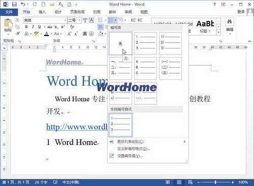 第4步,返回Word2013文檔窗口,在文檔中輸入任意數(shù)字(例如輸入阿拉伯?dāng)?shù)字1),然后按下Tab鍵。接著輸入具體的文本內(nèi)容,按下回車(chē)鍵自動(dòng)生成編號(hào)。連續(xù)按下兩次回車(chē)鍵將取消編號(hào)狀態(tài),或者在“開(kāi)始”功能區(qū)的“段落”分組中單擊“編號(hào)”下拉三角按鈕,在打開(kāi)的編號(hào)列表中選擇“無(wú)”選項(xiàng)取消自動(dòng)編號(hào)狀態(tài),如圖4所示。