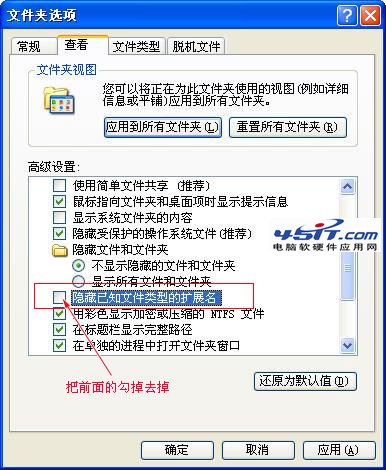 步驟二在“文件夾選項”窗口中選擇“查看”選項卡然后在“高級設置”中找到“隱藏已知文件類型的擴展名”把前面的勾去掉然后按下面的“確定”按鈕就可以了如圖所示