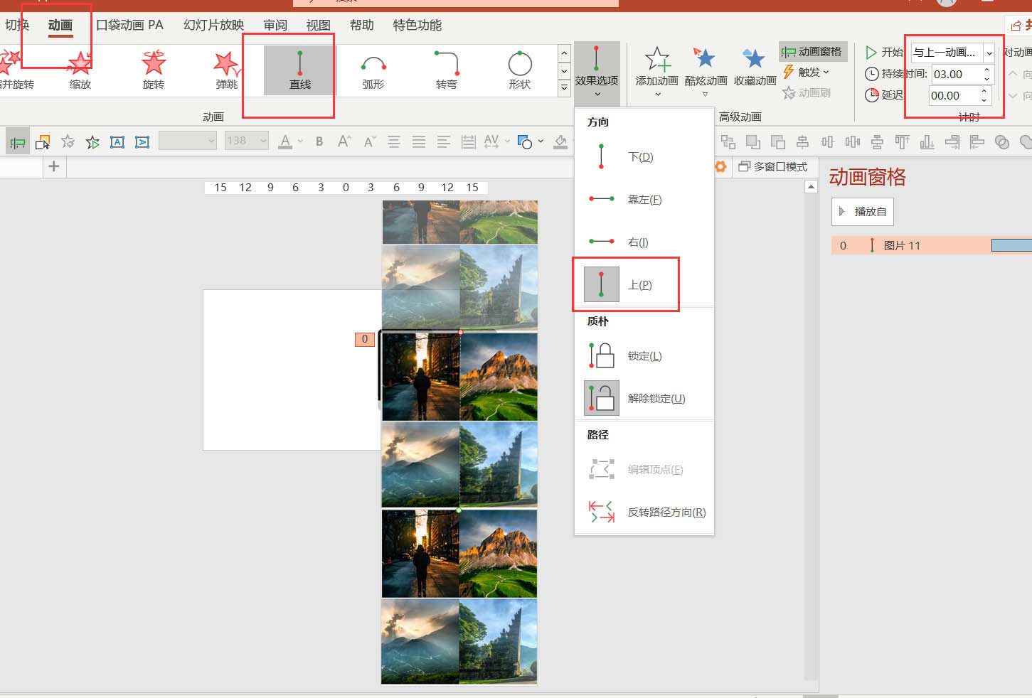 6、給長圖添加動畫。動畫-直線路徑-向上-與上一動畫同時-持續時間自己任意選擇。
