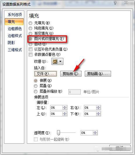 在“設(shè)置數(shù)據(jù)系列格式”對(duì)話框的“填充”選項(xiàng)卡中,進(jìn)行如下圖所示的設(shè)置。