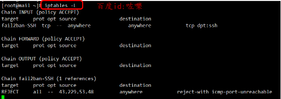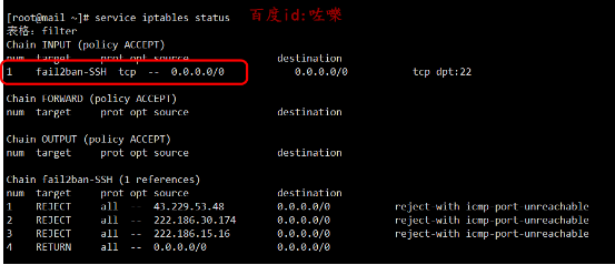 可以通過service iptables status 如圖(如果有其他組件如fail2ban也會調用防火墻規則) 后面就是規則鏈