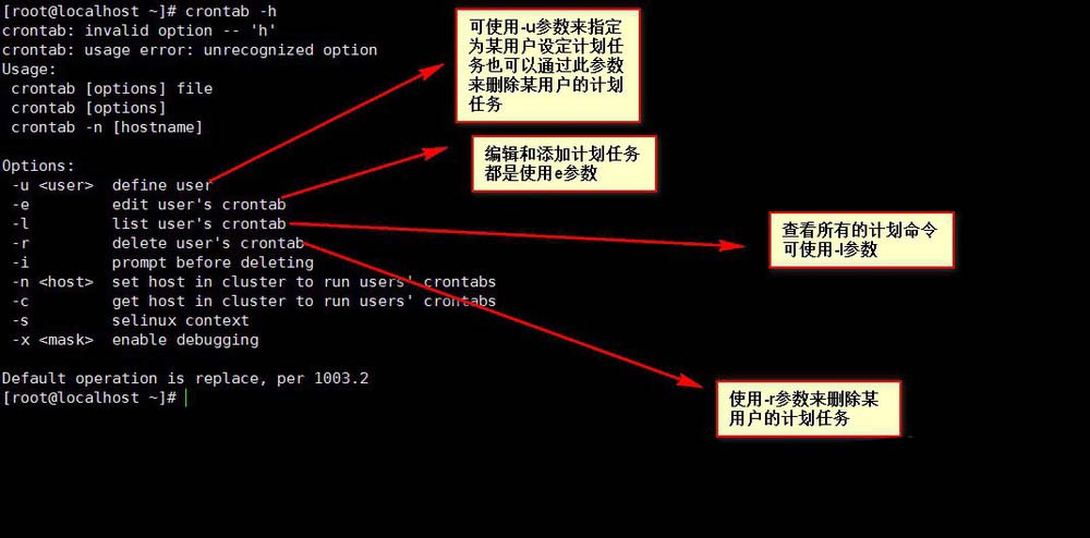 4、crond服務提供crontab命令設置計劃任務,crontab命令可通過-h命令來查看一些參數信息