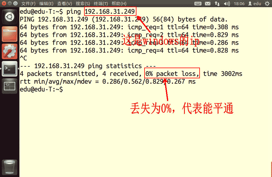 1)如果是某個Windows主機要訪問ubuntu的共享目錄,這兩系統的網絡必須要能平通,否則,無法訪問,下圖為ubuntu去平Windows的ip: