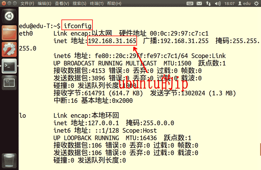 2)獲得ubuntu的ip,在終端下敲:ifconfig。