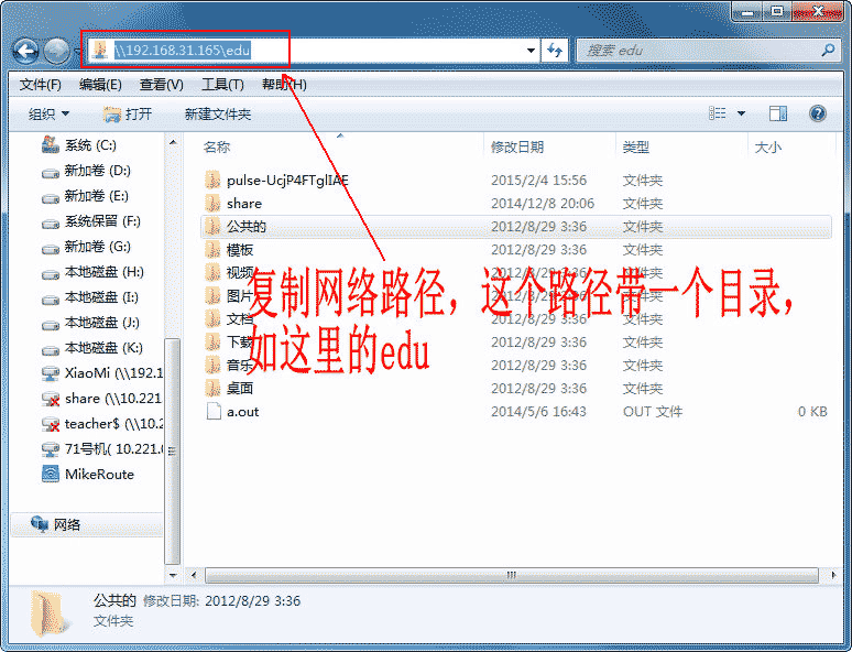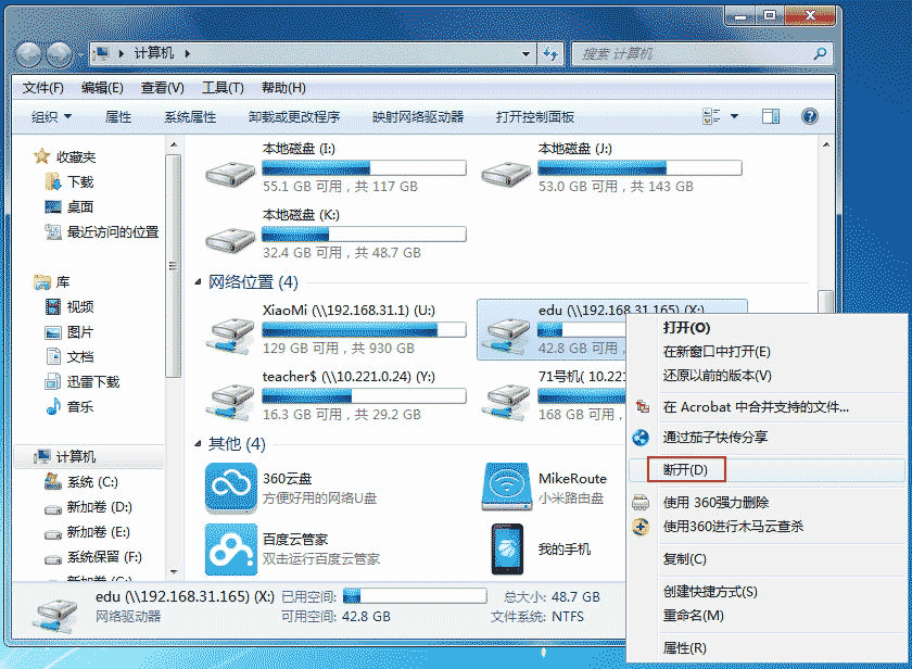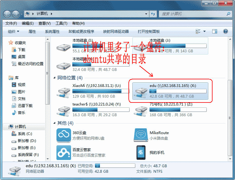 以后我們直接打開我的電腦,即可看到這個共享目錄,直接打開即可(前提是ubuntu已經開啟了)。如果我們不想使用了,也可斷開個網絡驅動器: