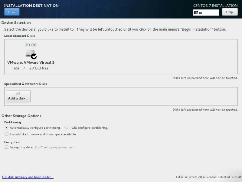 這個選項可以確保你的磁盤會恰當地根據磁盤空間和 Linux 文件系統層次結構進行分區。它會為你自動創建 /(root)、/home和 swap 分區。點擊“完成Done”來應用磁盤分區方案并回到主安裝界面。