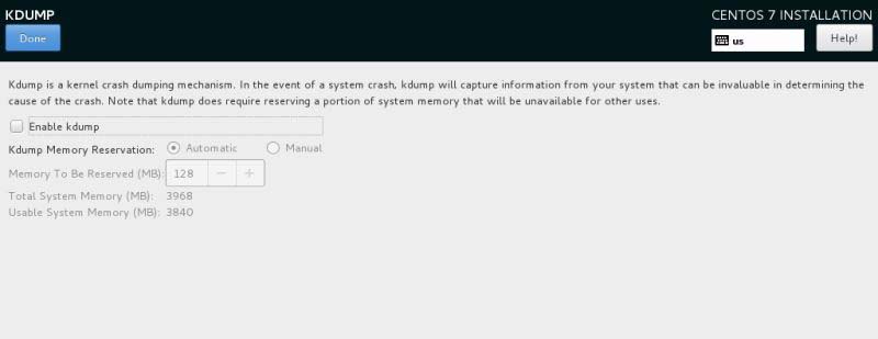 10、 接下來,如果你想要釋放系統內存,點擊 KDUMP 選項并禁用它。點擊“完成Done”并回到主安裝界面。