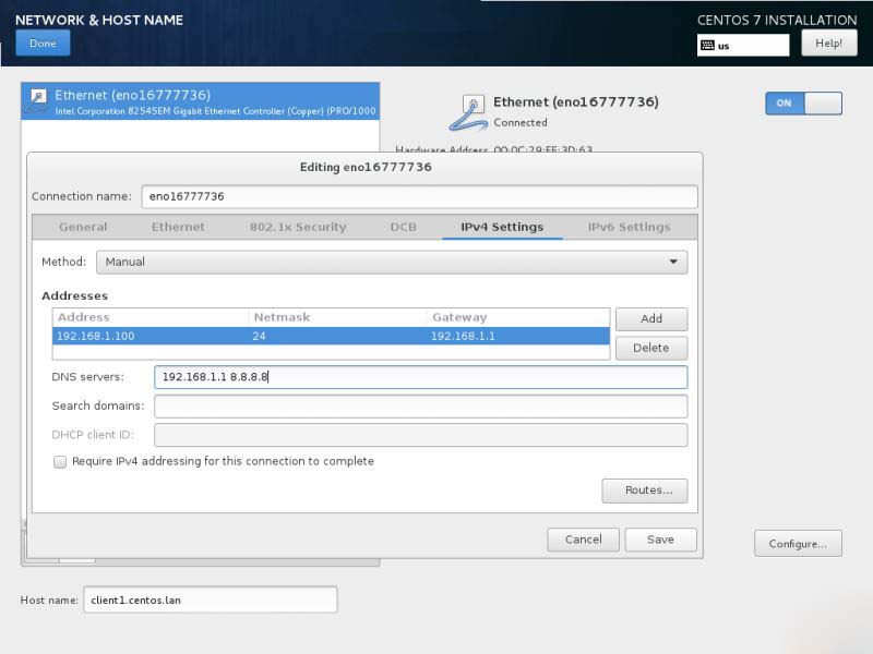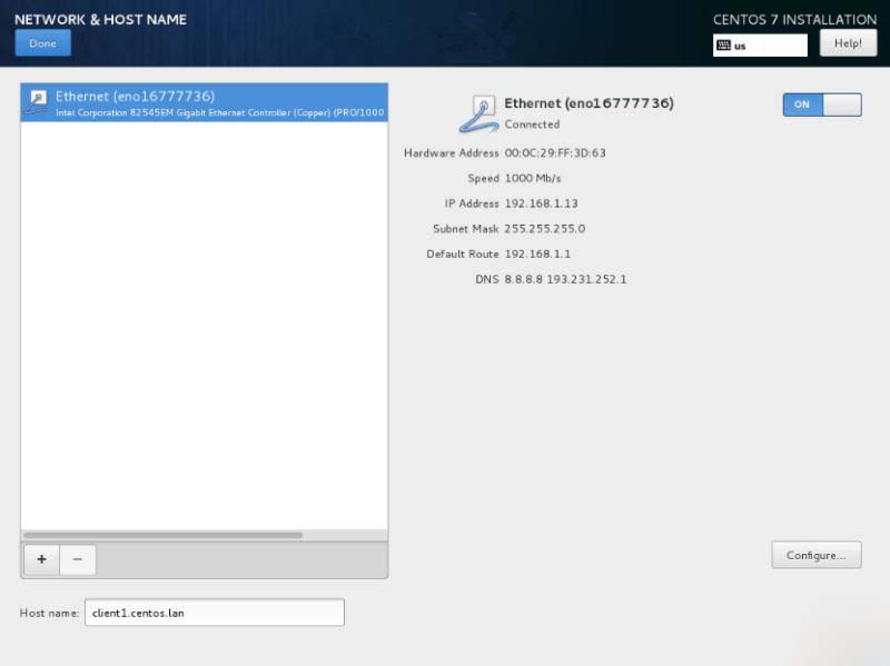 11、 在下一步中設置你的主機名并啟用網絡服務。點擊“網絡和主機名Network & Hostname”,在主機名中輸入你的 FQDN(完整限定網域名稱),如果你在局域網中有一個 DHCP 服務器,將以太網按鈕從 OFF 切換到 ON 來激活網絡接口。