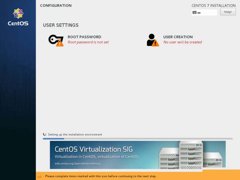 14、 開始安裝后,一個新的設置用戶界面會顯示出來。首先點擊 “root 密碼ROOT PASSword”并添加一個強密碼。